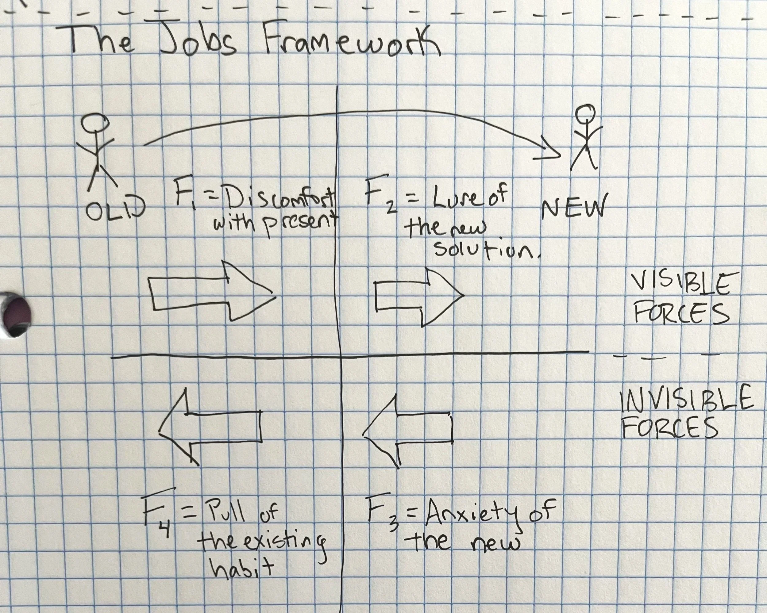 “Jobs Theory” teaches us that there are four forces at work that drive people towards and away from change. To get a person change they must endure discomfort in the form of a “struggling moment” (F1) AND that discomfort must be great enough that it creates the context where they open to the “lure of your new solution” (F2). These two forces push the consumer from their old way to your new way.